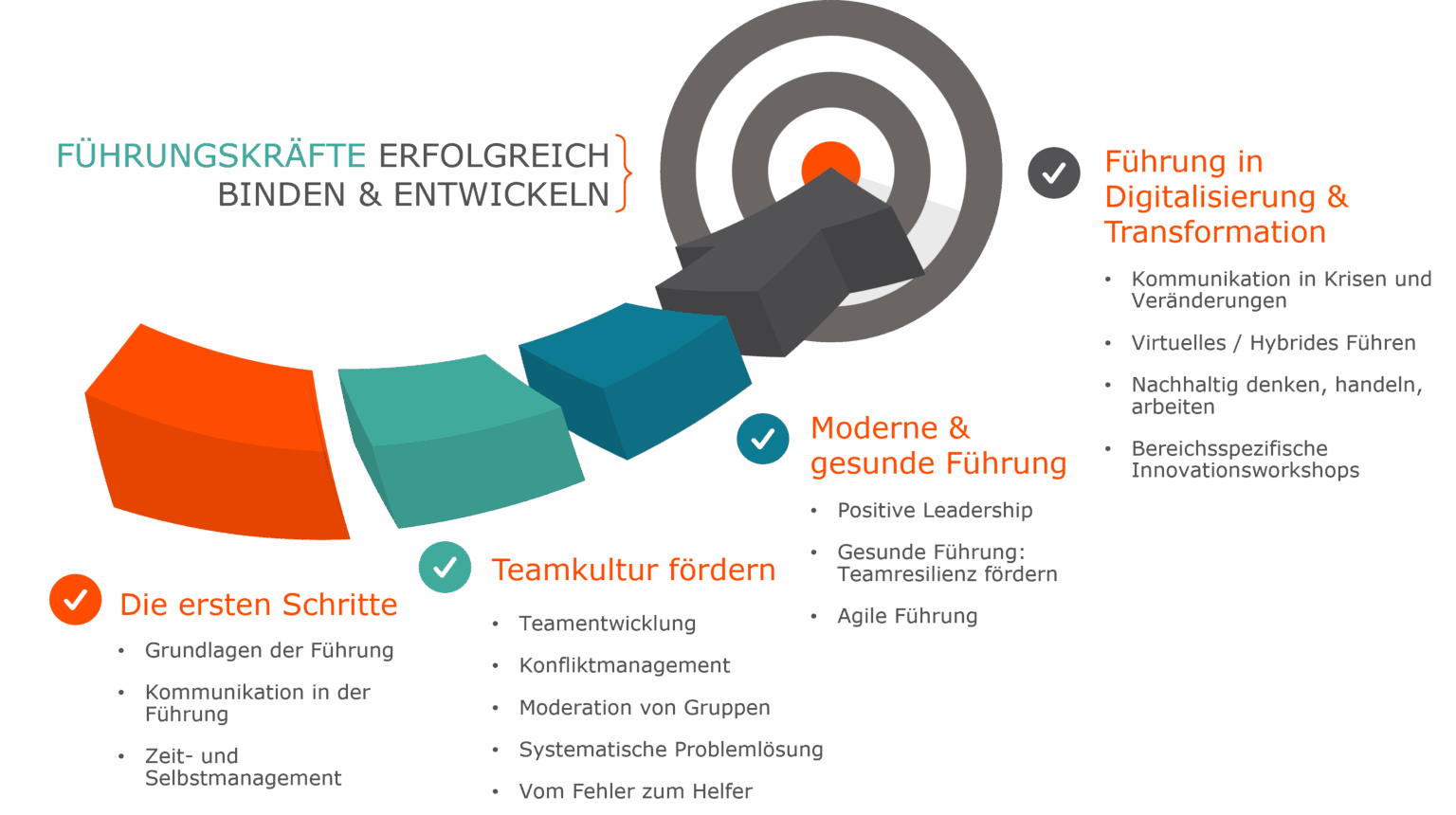 Führung ist der Hebel für Leistung, Bindung und Kultur – besonders in Zeiten von Digitalisierung, Verdichtung und Veränderung. Eine wirksame Führungskräfteentwicklung ist kein Nice-to-have, sondern Business-Priorität. Unsere Führungskräfteentwicklung setzt auf praxistaugliche Formate, klare Lernziele und echte Umsetzung im Alltag. Mit Trainings und Schulungen für Führungskräfte, Führungswerkstätten, Einzel-Coachings sowie integrierten Programmen zur systematischen Führungskräfte-Entwicklung und bei Bedarf der Ausrichtung von Führungskräfte-Konferenzen begleiten wir Sie inhouse – passgenau für Branche, Größe und Reifegrad es Unternehmens bzw. Ihrer Führungskräfteentwicklung.